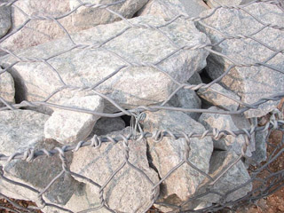 鉛絲石籠并非是由真“鉛絲”編制,舊時(shí)指鍍鋅的鐵絲,因其不易生銹,而且顏色像鉛,故名叫鉛絲。鉛絲石籠的形狀根據(jù)實(shí)際要求可以做成網(wǎng)箱、網(wǎng)墊、網(wǎng)卷,箱內(nèi)填充規(guī)定要求的石料,以形成自透水的、柔性的、生態(tài)的格網(wǎng)防護(hù)結(jié)構(gòu)。